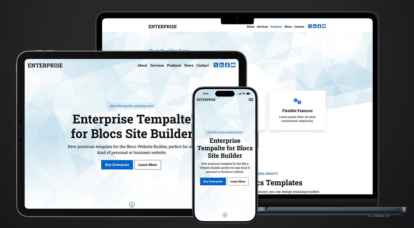 Weβre proud to announce the Enterprise Template 5.0 β a modern, sleek Blocs 6.2 design built from the ground up with the Minimalist Library. Perfect for business, corporate, or personal websites, itβs fully optimized for all devices and features fade-in/out gradients, smooth hover effects, Parallax sections, and improved typography.