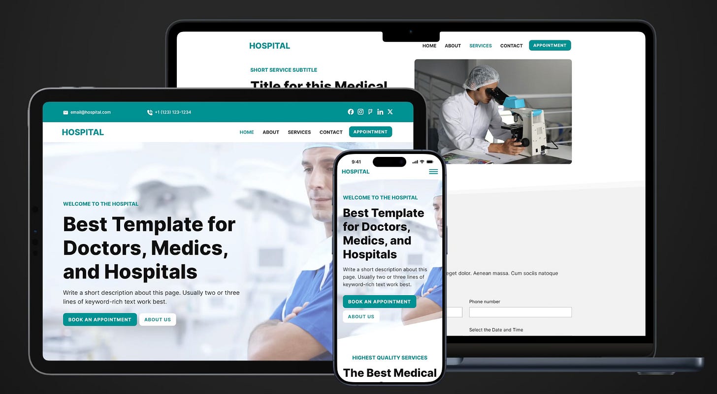 Custom buttons, a redesigned contact form with styled alert messages, and immersive parallax image backgrounds add depth and polish. Like all our modern templates, Hospital 3.0 is speed-optimized and SEO-ready, ensuring top-tier performance and visibility.