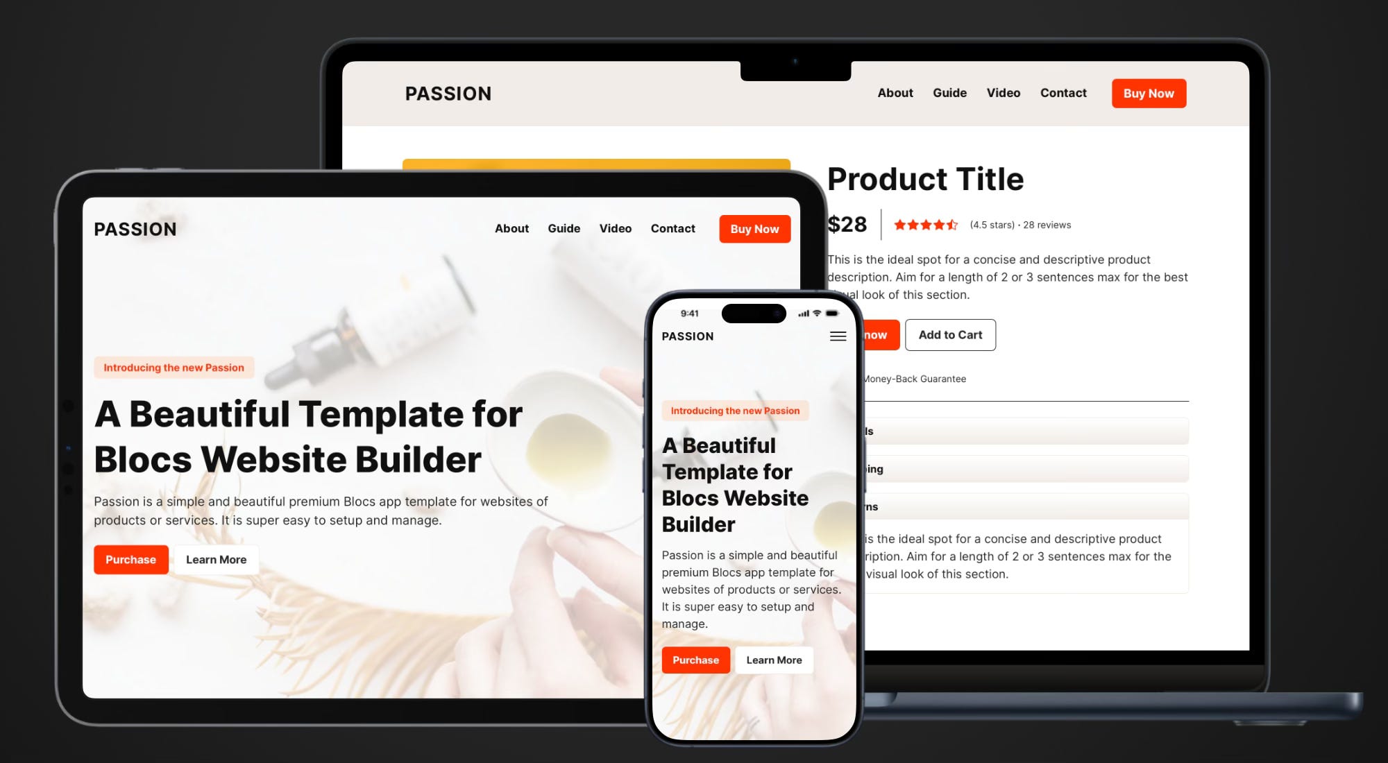 We’re proud to introduce Passion Template 6.0 — the latest and most refined version of one of our oldest and most beloved templates. Completely rebuilt from the ground up using Blocs 6.2 and styled with the Minimalist Library, this update delivers a sleek, modern dark design packed with elegant animations and polished visual details throughout.